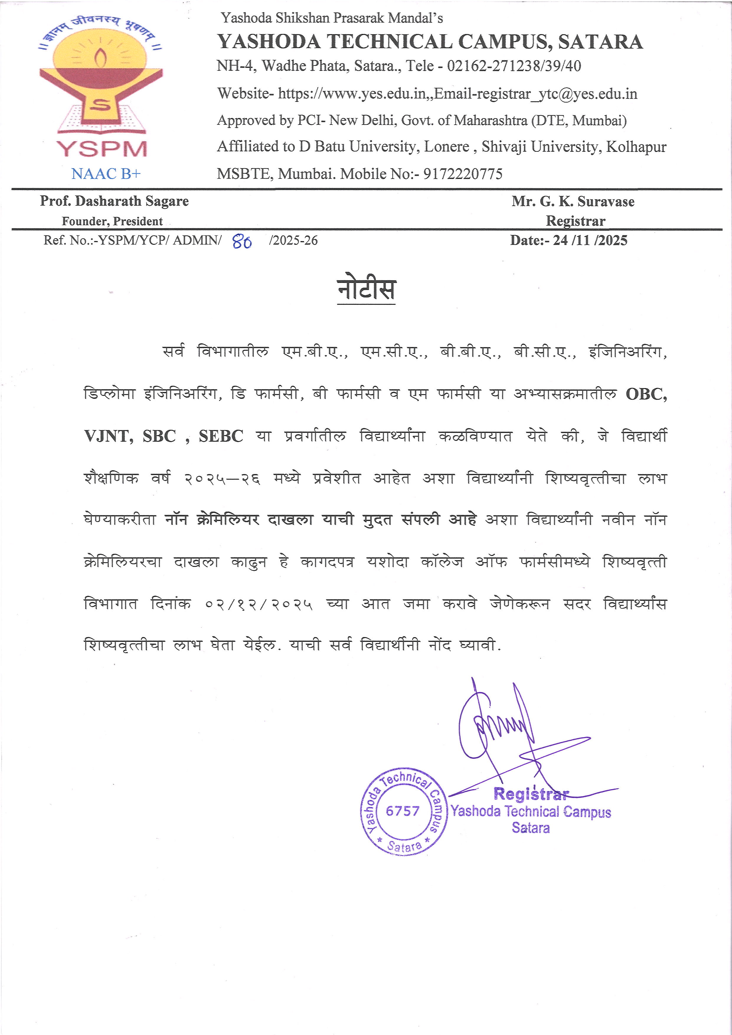 नोटीस - नॉन क्रेमिलीयर दाखला काढून ते कागदपत्र शिष्यवृत्ती विभागात जमा करणे बाबत.. |