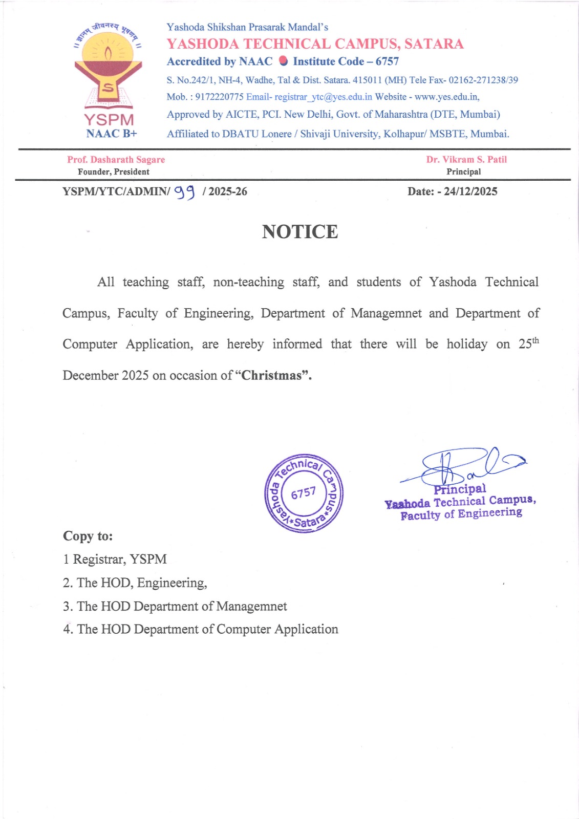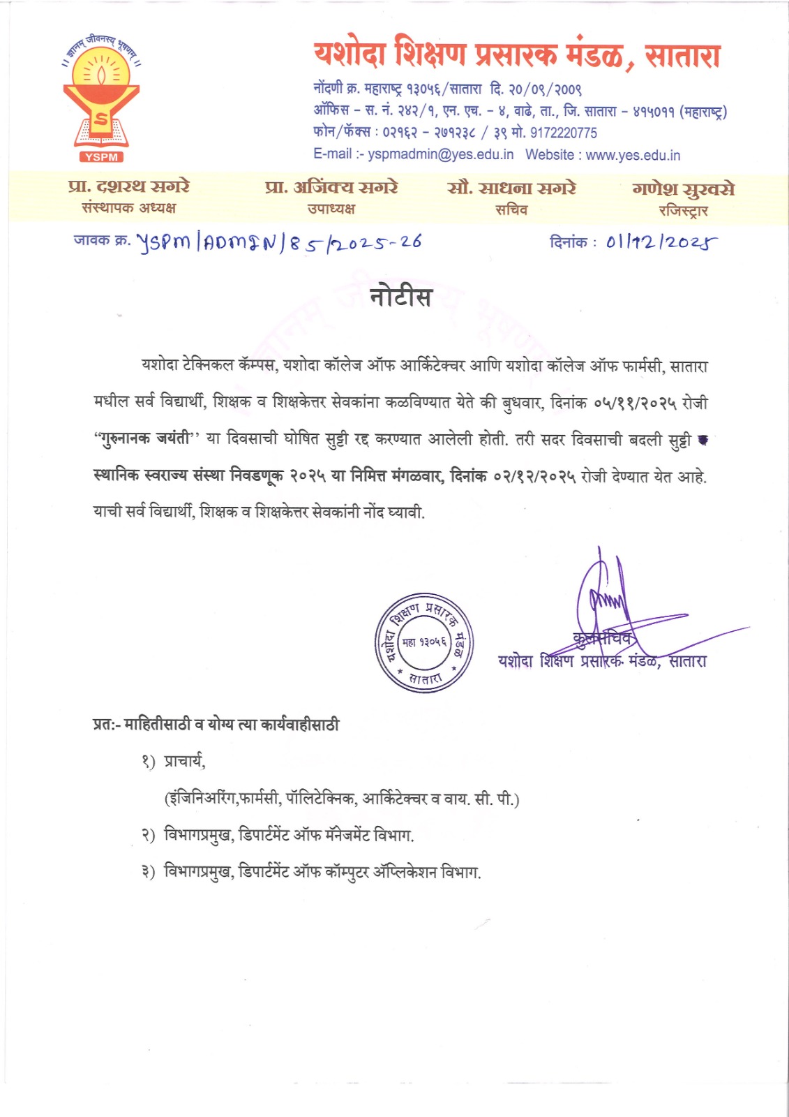 महाविद्यायास २६ जुलै रोजी सुट्टी राहील |